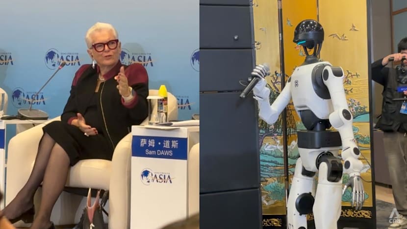 A composite image of a humanoid robot from the Beijing Humanoid Robot Innovation Centre asking former New Zealand Prime Minister Jenny Shipley how robots can earn public trust during a panel at the Boao Forum for Asia, held in Hainan, China, Mar 25, 2026. (Photo: CNA/Melody Chan)