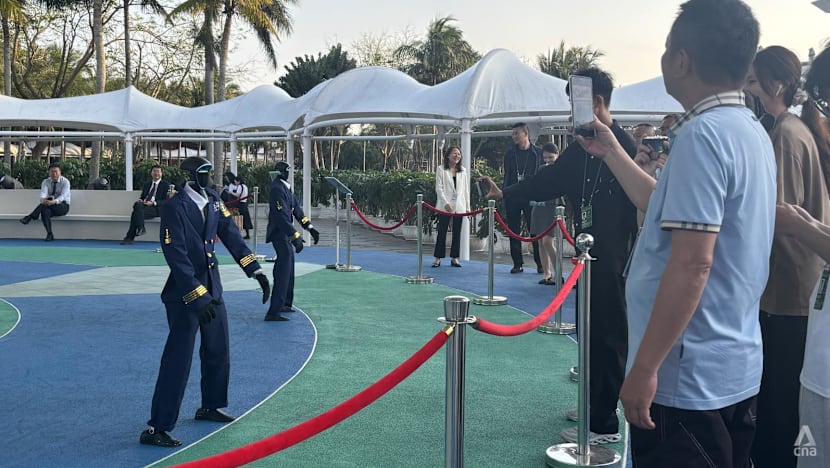 Onlookers watch as humanoid robots perform dances outside the media centre at the Boao Forum for Asia, Hainan, China, on Mar 24, 2026. (Photo: CNA/Melody Chan)